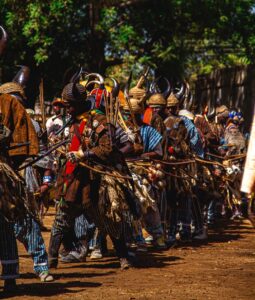 What follows is the most captivating part of Feok: the war dances. Men dressed as warriors, armed with bows, arrows, spears, and shields, storm the arena in dramatic fashion, reenacting the battles of old. The pounding of drums, the chants of women, and the rhythmic stamping of feet create an atmosphere that is both festive and fierce. It is history relived in dance, reminding all present of the bravery of their ancestors.